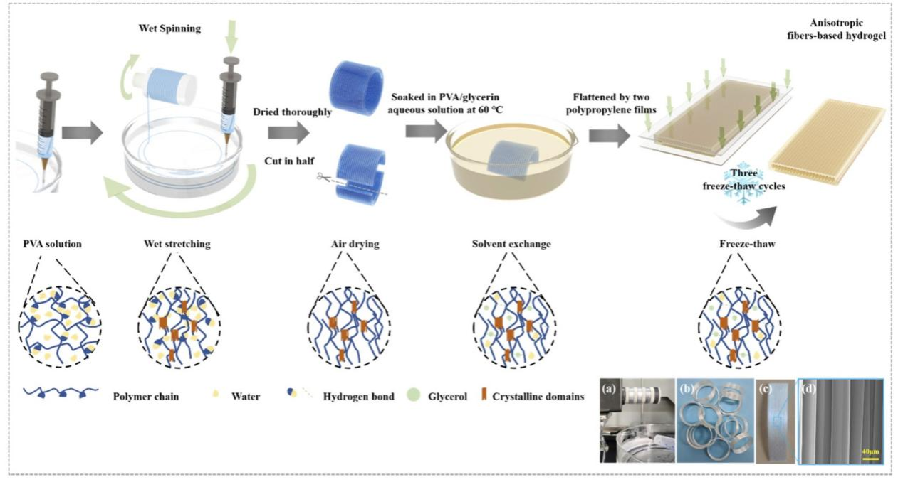 如图1所示,定向收集湿法纺丝制备的连续均匀的PVA纤维;利用PVA的水溶性和吸湿性,将PVA纤维的聚集体浸泡在PVA/甘油水溶液中溶胀;经冻融循环,获得了一种具有优异的力学性能可调、透明度、良好生物相容性和长期环境稳定性的各向异性纤维基水凝胶。所制备的水凝胶拉伸强度为12.8 ±0.7 MPa,断裂功为134.47 ± 9.29 MJ m3,可拉伸性高达1719 ± 77%。