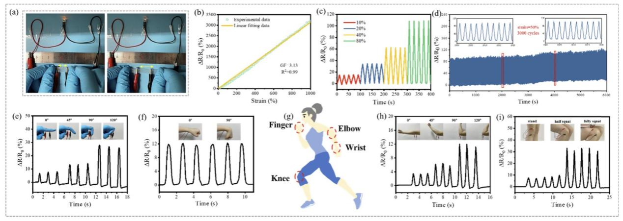 如图6所示,作为应变传感器,表现出优异的传感性能,在0-1000%的应变范围内,灵敏度(GF)为3.13,相应的线性度(R2)为0.999,高于大多数报道的水凝胶应变传感器。此外,响应时间短,应变检测范围广,且具有良好的动态稳定性。