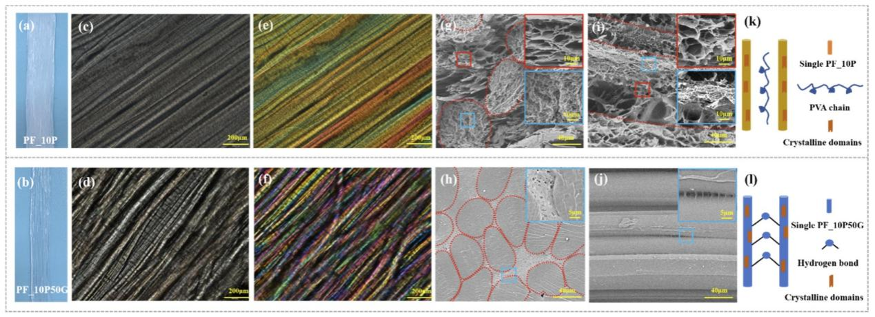 各向异性纤维基水凝胶的结构如图2所示。利用偏振光显微镜分析了其各向异性结构和双折射性。此外,SEM显示出完全不同的形貌,进一步证明其各向异性结构。