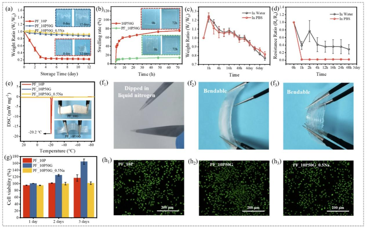 如图5所示,所制备的水凝胶表现出较强的环境适应性:即优异的抗溶胀性能、保水能力、防冻性能及生物相容性。