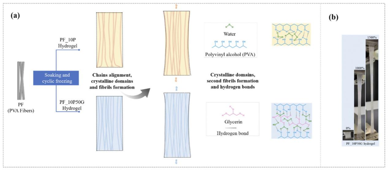 如图4,在微观尺度上,甘油的加入导致与PVA链形成氢键相互作用。这些氢键有效地交联PVA链并促进其结合,从而使PVA纤维具有更高的强度、模量和韧性;同时,氢键(由甘油引入)可以促进动态断裂和再交联,使断裂的键重新连接,这也有助于改善PVA纤维的机械性能;此外,甘油能够提高水凝胶的有效交联密度,氢键区可用于实现裂纹扩展不敏感性。在宏观尺度上,PVA基质作为粘合剂,可将PVA纤维连接在一起,提升其断裂应力;PVA纤维增强了PVA基体结构,也在一定程度上提高了其力学性能。