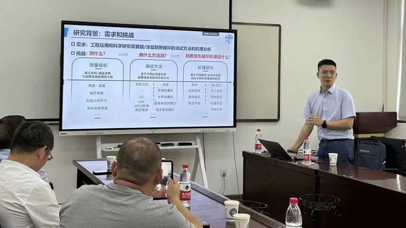 在报告中,蒋晗教授指出刮擦造成的表面划痕会导致柔性膜/涂层系统的结构完整性、功能稳定性和美观性的严重劣化,因此工程应用和科学研究需要柔性膜/涂层刮擦破坏的测试方法和机理分析。同时,蒋晗教授总结了团队在柔性膜/涂层刮擦测试方法和机理分析方面的研究进展,最后给出了膜/涂层刮擦的测量指标和测试方法,揭示了刮擦变形破坏机理,为制定柔性膜/涂层表面刮擦测试的行业标准提供支撑。报告吸引了众多青年教师及本科生、研究生同学参加。