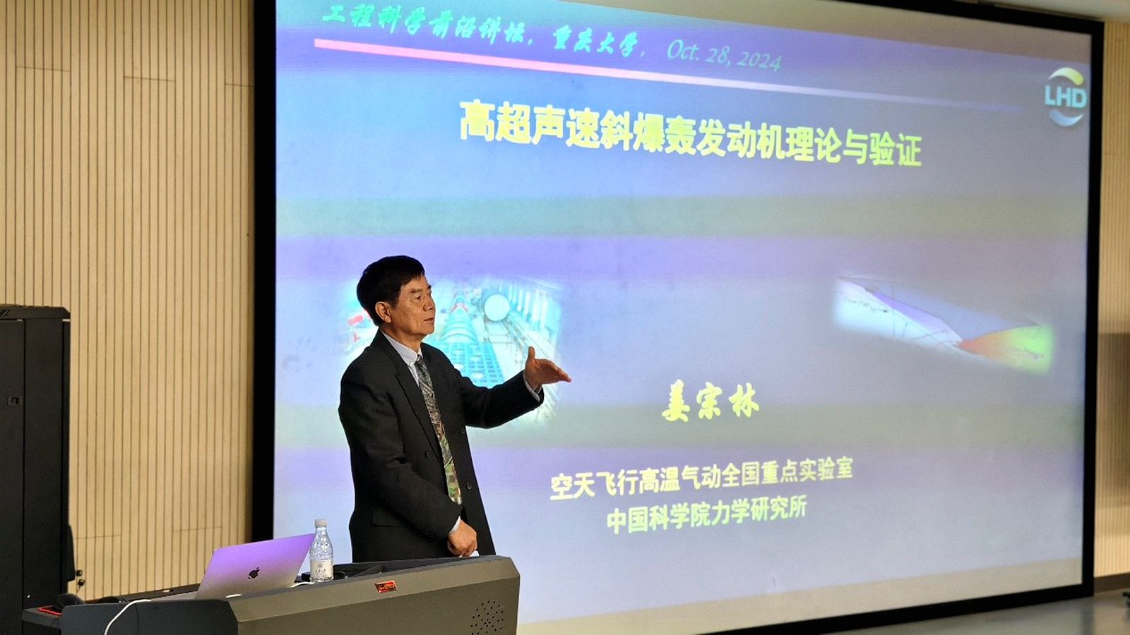 在报告中,姜宗林研究员介绍了超燃冲压发动机的研发进展与困境,提出了高超声速发动机设计三准则,界定了准则内涵和应用范围,并给出了理论分析和试验验证。他还结合团队研究成果,介绍了依据三准则设计的高超声速斜爆轰发动机及其风洞试验结果,展示了斜爆轰发动机工程研发的基础和可行性。