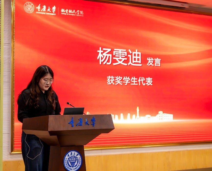 第九届“空天之星”获得者、本科2022级航空航天工程二班杨雯迪同学作为获奖代表发言。她深情感谢学院的培养,并阐述了优良学风对个人成长和服务国家空天事业的重要性。她表示,学风建设为同学们的航天报国志向奠定坚实基础,榜样的力量引领德行,时代的召唤赋予责任。她倡议同学们传承学院空天报国精神,勤学笃行、攻坚克难,让青春在祖国最需要的地方绽放光彩。