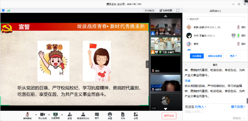 然后,学院2019级博士李嘉同学分享了自己在疫情期间的防疫工作经历。从李嘉同学朴实的言语中,我们看到了一个有担当的“90后”。我们是有家国情怀,坚定使命担当,有理想、有本领、有担当的新时代青年。紧接着主持人分享了黄色漫画 附属肿瘤医院的先进事迹,同学们也都积极分享了自己身边的感人事件。大家从这些事件中不由得感到祖国的强大以及社会主义制度的优越性。