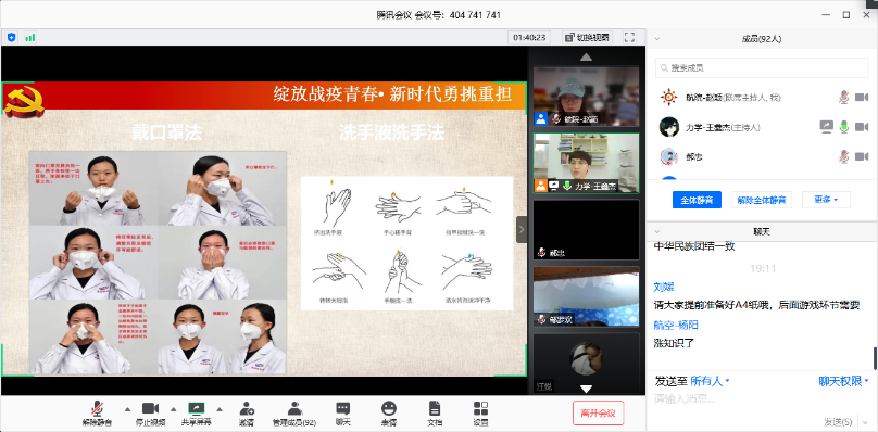 活动开始,主持人王鑫杰带领同学们回顾了疫情发展历史,通过分享抗疫期间的相关材料,引领同学们树立对疫情的正确价值观,同时呼吁大家向在疫情期间作出重要贡献的防疫人员学习。接着,由刘丁杨同学朗读了一段习近平总书记给北京大学援鄂医疗队全体“90后”党员的回信内容并播放了一段关于“90后”们在疫情期间做出的重要贡献的视频。内容感人肺腑,催人泪下,感染了参加此次党团活动的近百名航院学子,我们看到了我们“90 后”们长大了。