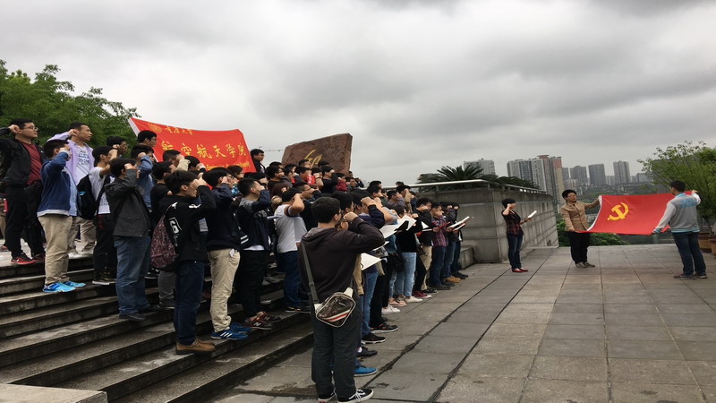 早上九点,党员们来到了红岩革命纪念馆前,有序地集合到一起,高举右手在党旗下庄严宣誓,重温入党誓词。在程乐书记的领誓下,全体党员们表达了为党的事业奋斗终身的决心,宣誓活动使全体党员重新经受了一次党的洗礼,接受了党性再教育。宣誓结束后,全体党员们高举党旗合影留念,每个同学都将这难忘的一幕铭记于心中。