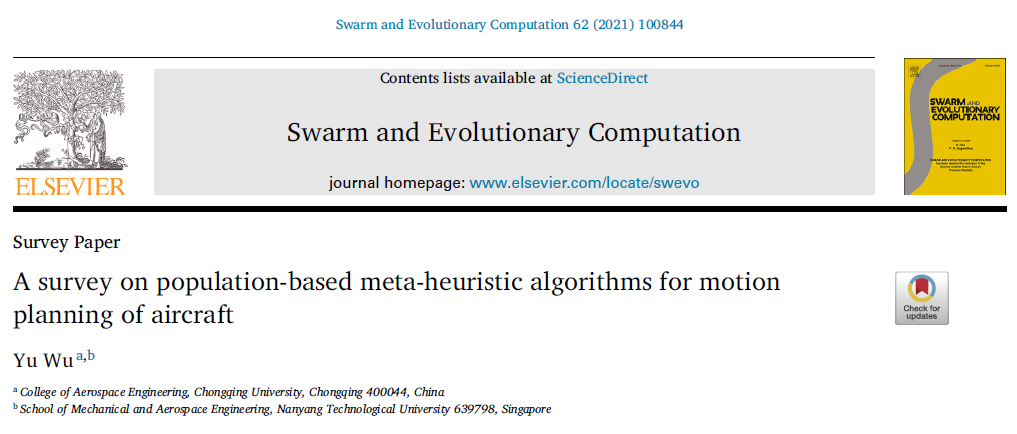 青年教师吴宇在智能计算权威期刊《Swarm and Evolutionary Computation》(中科院分区计算机科学1区Top期刊,影响因子6.912)发表了题为“A survey on population-based meta-heuristic algorithms for motion planning of aircraft”的综述论文,吴宇老师为该论文的唯一作者。