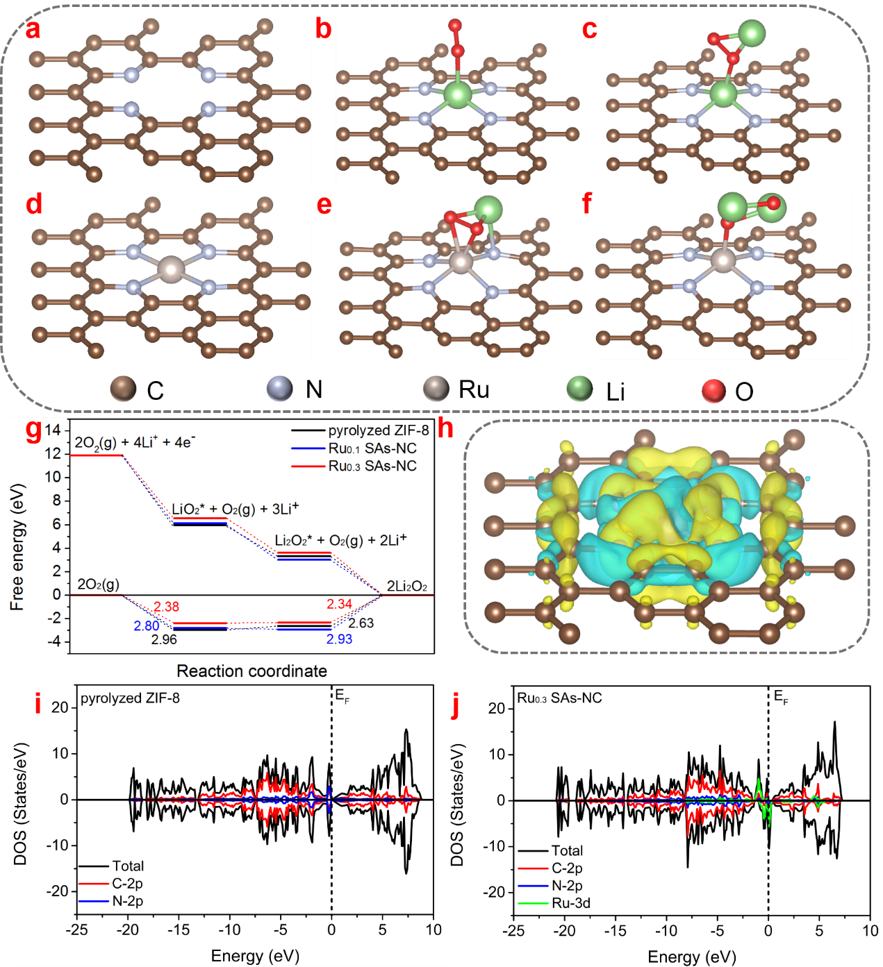 一般而言,单原子催化剂可以最大限度地增加催化活性中心,并能够有效地调节电子结构,从而赋予电催化剂优越的ORR/OER性能。通过采用优化的Ru0.3 SAs-NC(单原子Ru的负载量为2.48%)作为电催化剂,所构建的锂氧电池在0.02 mA cm−2的条件下可提供13424 mA h g−1的高放电容量,在1000 mA h g−1的截止比容量下,最低ORR过电位可低至0.17 V。原位DEMS结果呈现出放电过程的e−/O2值仅为2.14,说明其电催化性能优越,可逆性佳。此外,单原子催化剂的高活性和单原子较大的载量有利于电化学反应过程中纳米尺度花状Li2O2的形成/分解。通过DFT模拟进一步证明了ORR过程在催化剂表面的限速步骤为发生2e−反应生成Li2O2,OER过程为Li2O2的分解反应,该结果为锂氧电池电催化剂的未来构建指明了方向,为制备单原子相关材料提供参考,以及更好地理解构效关系有一定的借鉴意义。