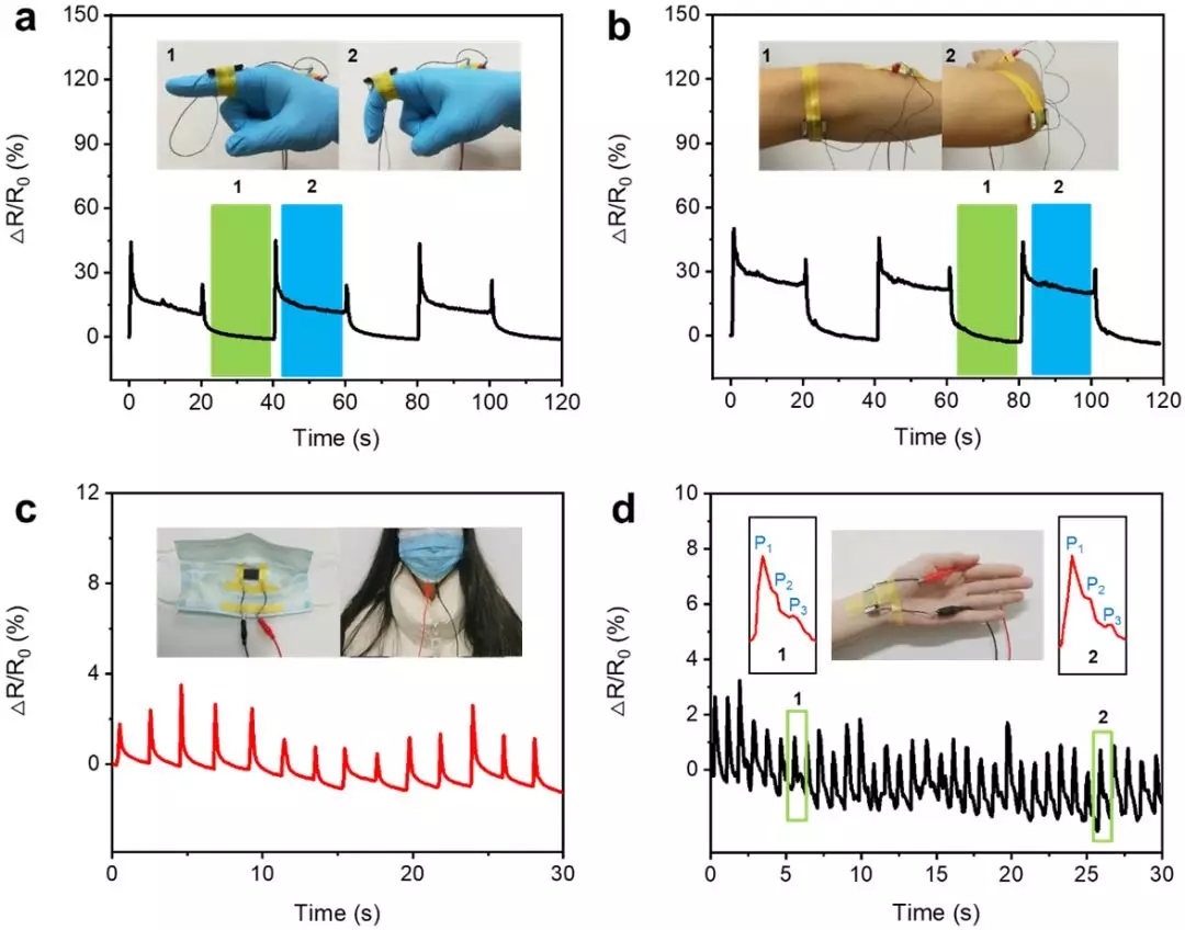 图5. 可穿戴设备的应用。(a)手指弯曲,(b)手臂弯曲,(c)运动时呼吸和(d)脉搏测试时传感器的电阻随时间的相对变化。