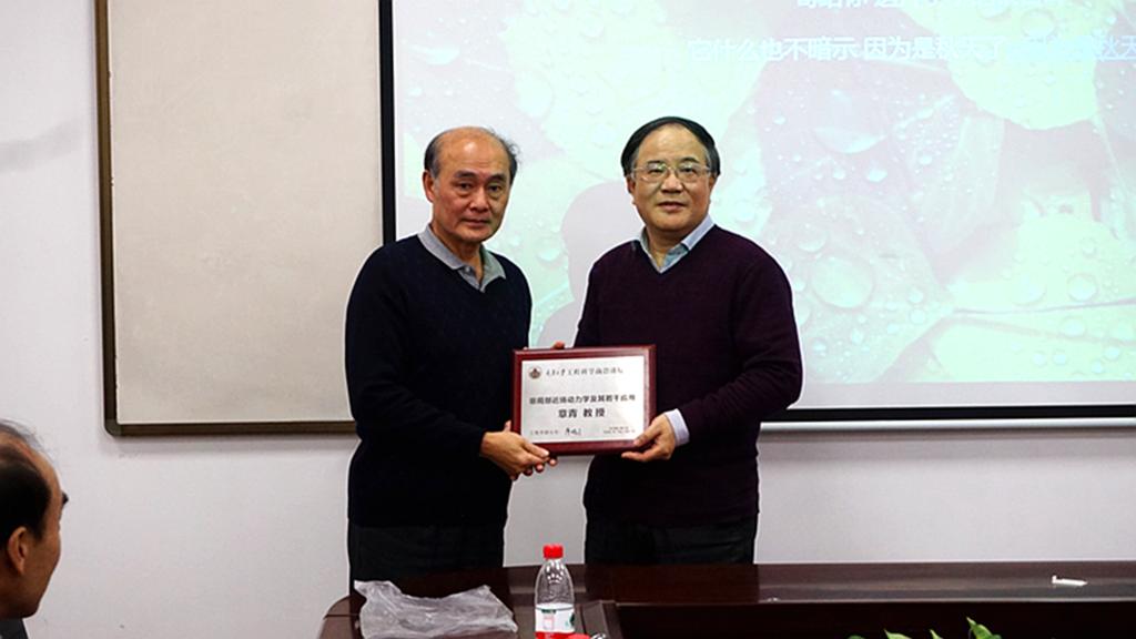 学术报告共持续了两个多小时,在场师生踊跃向章青教授、王磊副教授提问并展开了深入的讨论和交流,讨论氛围十分热烈。报告最后,学院彭向和教授为章青教授颁发了工程科学前沿讲坛纪念牌,并再次代表学院领导和同学们对两位教授表示真诚的感谢。