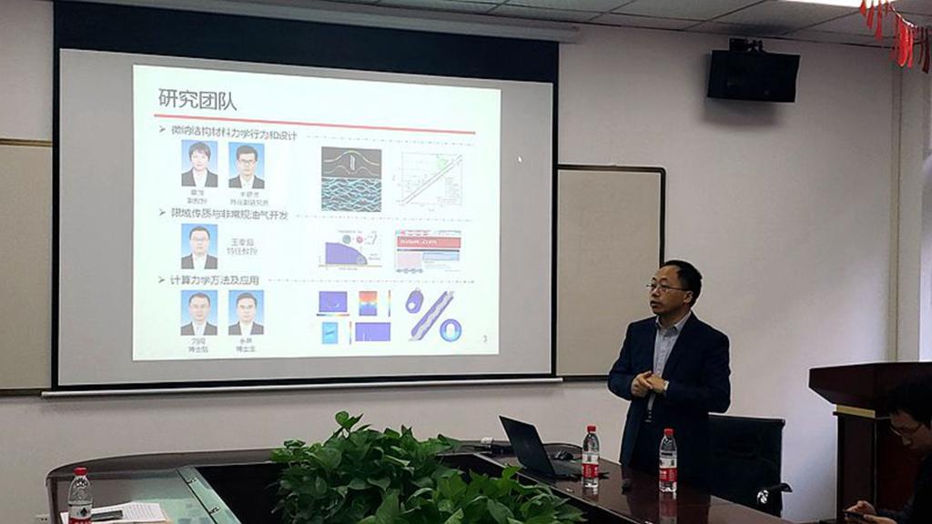 刘占芳首先对吴恒安教授作了简要介绍。吴教授是中国科学技术大学工程科学学院近代力学系博士生导师,中国科学院材料力学行为和设计重点实验室主任。研究领域包括“微纳结构材料力学行为和设计”,“限域传质与非常规油气开发”,“计算力学方法及应用”等。已在Science和Nature等学术期刊发表被SCI收录论文140余篇,被SCI他引5000余次,入选国家“万人计划”科技创新领军人才、科技部创新人才推进计划中青年科技创新领军人才,获国家杰出青年科学基金等。