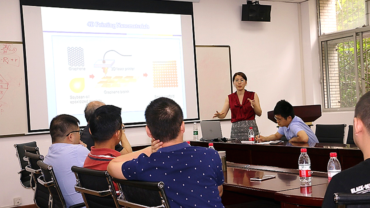 在报告中,Lijie Grace Zhang博士结合她丰富的研究工作经历,介绍了其课题组开发的智能墨水和用先进的3D/4D生物打印技术制造下一代复杂组织结构(如血管化组织、神经组织和骨软骨组织),同时设计并合成了新型仿生纳米材料(即自组装材料和导电碳纳米材料)和智能天然材料。其团队通过3D/4D生物打印,成功制备了一系列仿生组织支架。这些生物打印纳米或智能支架不仅具有改善的力学性能,而且具有优异的细胞相容性,用于增强各种细胞生长和分化,从而有望用于复杂的组织/器官再生。Lijie Grace Zhang博士的报告内容详实,让在场的老师和学生对3D/4D生物打印技术有了全新的认识,获得在座师生阵阵掌声。在提问环节她也与在座师生进行了深入的讨论交流,就3D/4D打印技术的区别,打印材料、仪器设备对组织的影响,打印组织的应用及应用中对受体本体间打印介质的要求、排斥反应问题和4D生物打印研究中目前面临的主要问题及在生物组织工程中的角色等作了详尽的讨论。