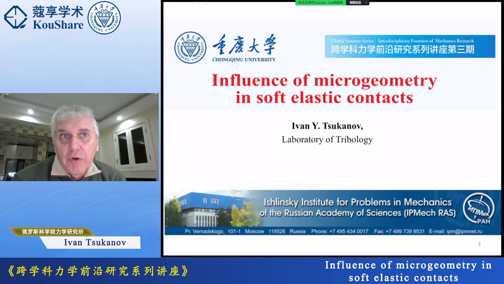 “跨学科力学前沿研究”全球系列讲座第3期在线召开。讲座邀请Ivan Tsukanov研究员开展了主题为“Influence of Microgeometry in Soft Elastic Contacts”的学术讲座。