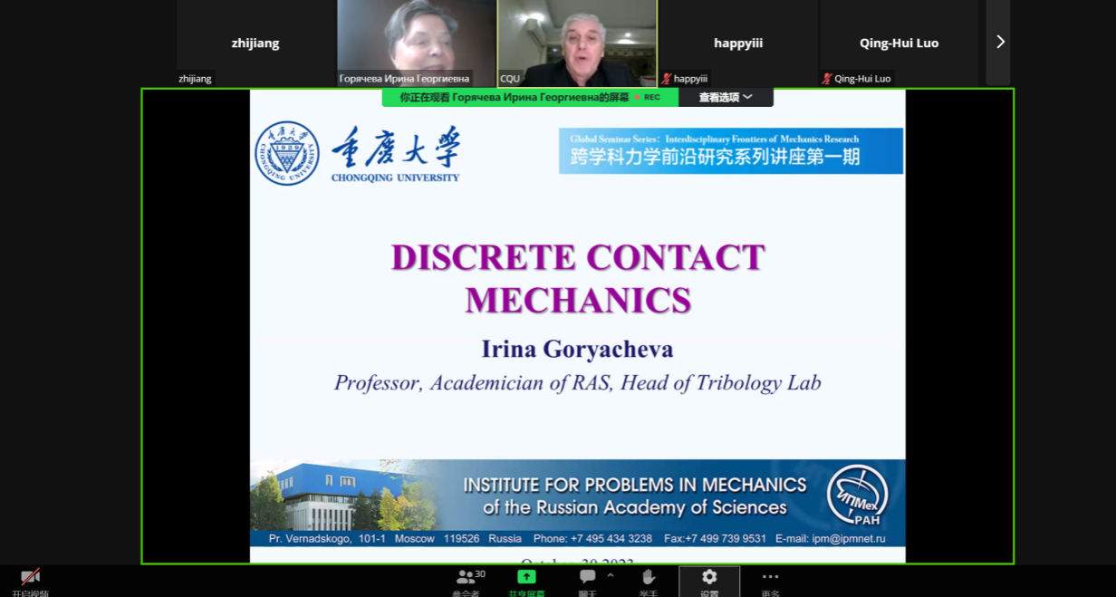 “跨学科力学前沿研究”全球系列讲座第1期在线召开。讲座邀请俄罗斯科学院院士Irina Goryacheva教授开展了主题为“Discrete Contact Mechanics”的学术讲座。