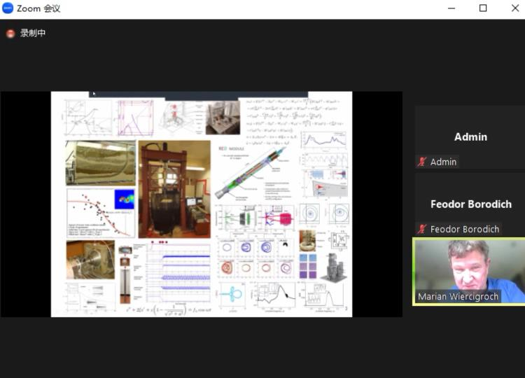 Feodor M. Borodich教授介绍了本次讲座的安排及嘉宾背景。Wiercigroch教授是Edinburgh皇家学院院士,现任职于英国Aberdeen大学。研究领域聚焦理论、实验非线性动力学及相关工程应用。发表了超过500篇期刊和会议论文,担任IJMS期刊主编。作为iVDynamics Ltd的创始人和首席技术官,发明了“共振增强钻探”技术专利。