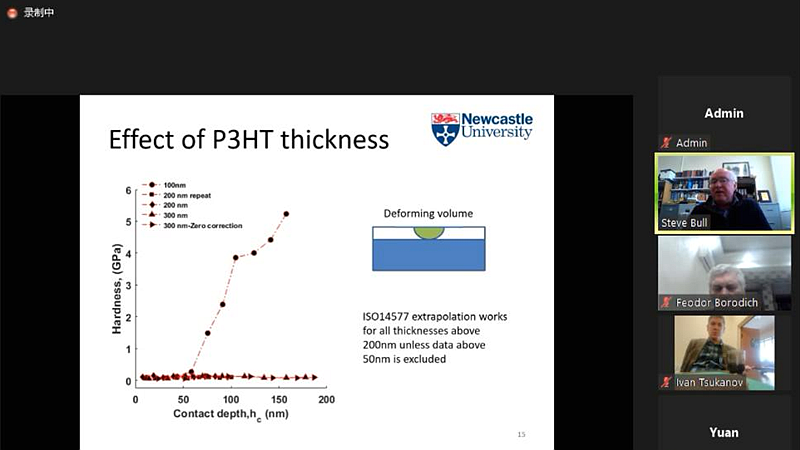 针对有机半导体薄膜应变和时间相关力学特性评估,Steve Bull教授着重介绍了在玻璃基板上使用纳米压痕法对100-300nm涂层样品开展的相关实验研究。针对能量在复合材料边界上的传递过程,John R. Willis教授着重讲解如何计算传入复合材料的平均能流和从边界反射的平均能流。