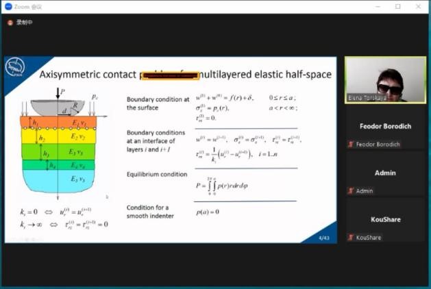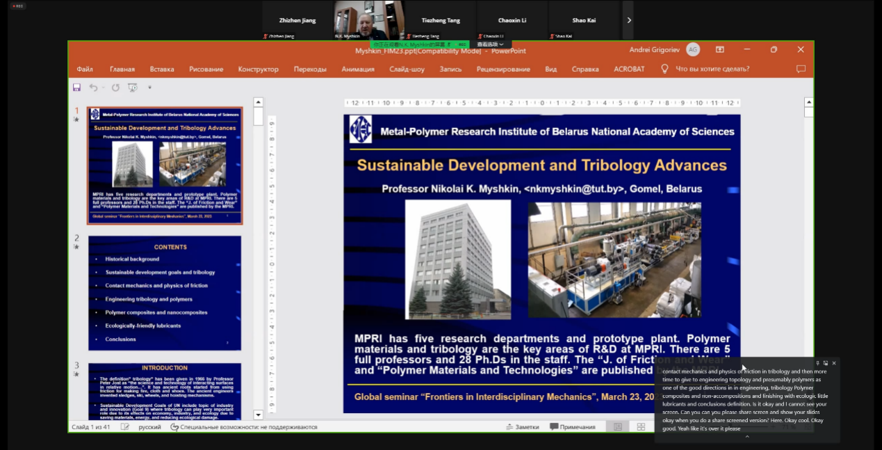 “力学交叉融合”全球前沿学科系列讲座第5期和第6期分别在线上召开。讲座先后邀请俄罗斯科学院教授Elena V. Torskaya开展了主题为“Frictional Contact of Coated Solids”的学术讲座、白俄罗斯国家科学院院士Nikolai K. Myshkin开展了主题为“Sustainable Development and Tribology Advances”的学术讲座。