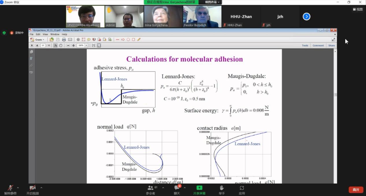 俄罗斯科学院外籍院士Fedor Borodich介绍了本次讲座的安排及嘉宾背景。Goryacheva教授担任俄罗斯科学院Ishlinsky力学问题研究所摩擦学实验室主任,莫斯科国立罗蒙诺索夫大学教授。她是俄罗斯国家理论与应用力学委员会主席、俄罗斯摩擦学委员会主席、RZD 科学委员会成员、国际摩擦学委员会副主席以及 IUTAM 主席团成员。 Goryacheva 教授发表了200多篇出版物,其中包括7部专著,分别荣获列宁共青团奖(1979年)、奥林匹亚国家妇女科学成就奖(2005年)、政府科技奖(2006年)和世界摩擦学金奖(2009年)。